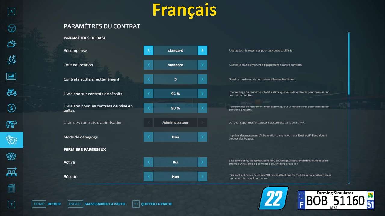 Hello everyone today I present to you the French version of the Mod BetterContracts (Better contracts) From Mmtrx Version 1.2.8.0 because many mods are not in French version, so I am translating it for you French players, for more info see the photos attached, good game to all.