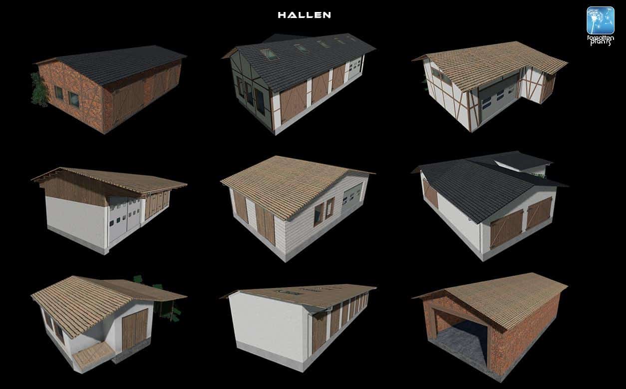 17 placeable buildings, halls, shelters and workshops with lights and gates