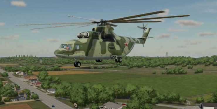 Transport helicopter MI-26T. It can transport various cargoes and vehicles in a large cargo compartment, there are cargo securing straps, and there is a hint for controlling the helicopter on the screen.