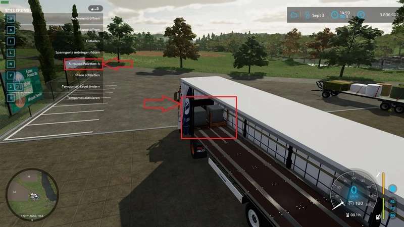 Activate loading with [B] and then drive next to a pallet or bale to load it.