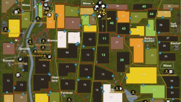 Productions include a brewery, a bakery, a pastry shop, an orchard, a peat factory, a sand cow, a sugar factory, a distillery, a malthouse, a mill and a refinery. There are also two sawmills, one for the production of wooden pallets and one with the wooden train of Giants (LS13). Also the grain train (LS13) is installed.