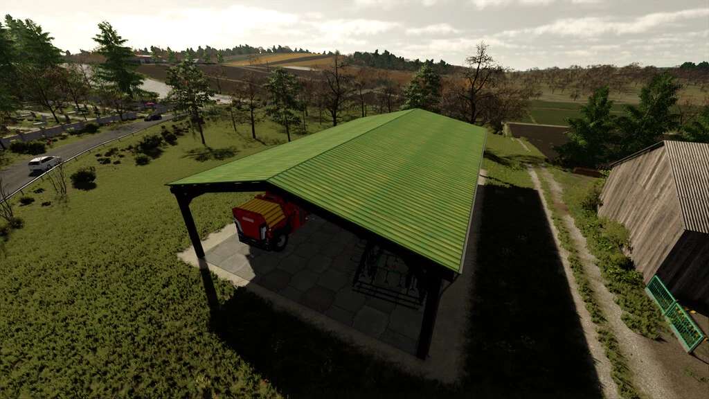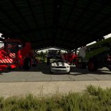 Large shed open to agricultural machinery.